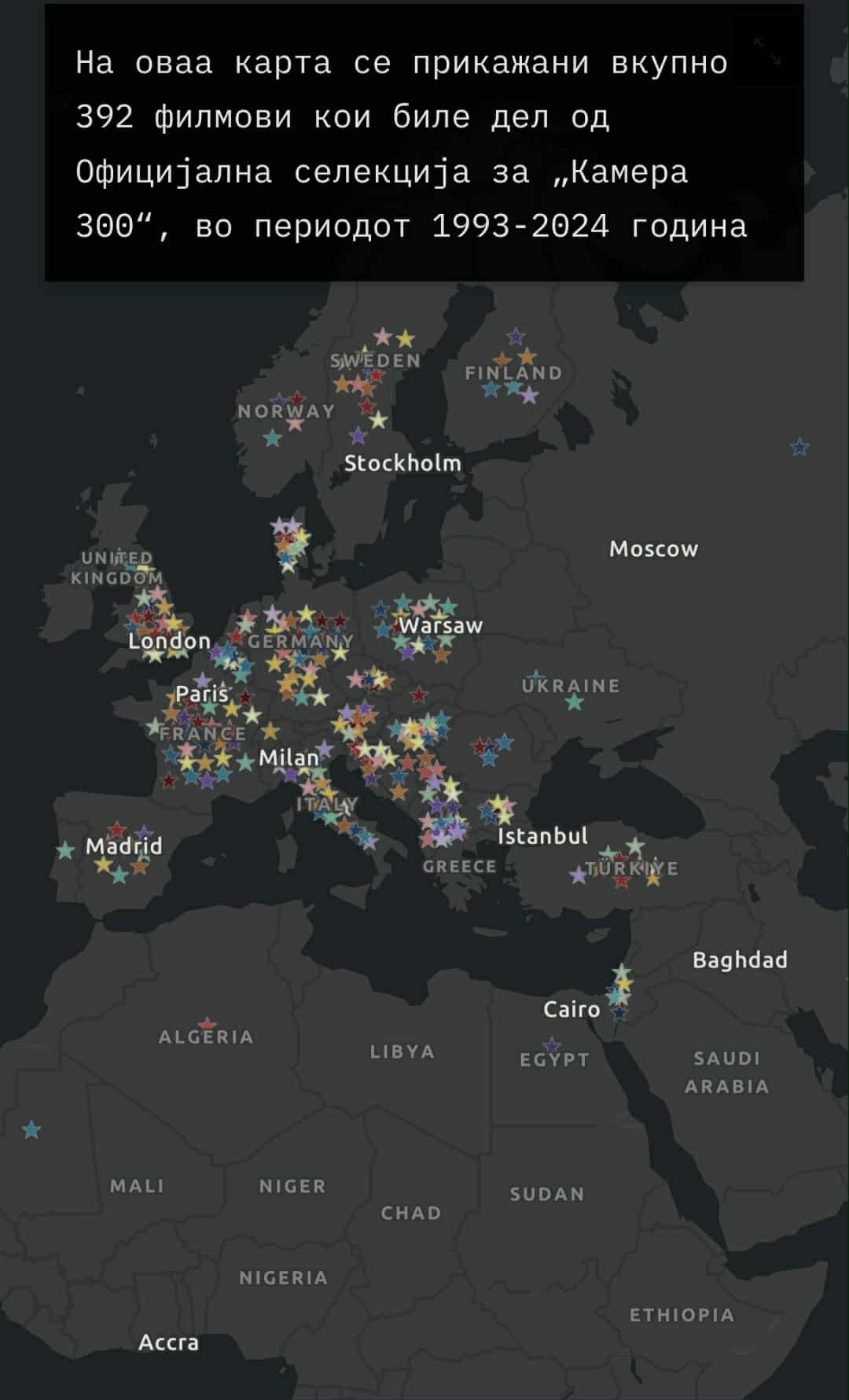Картата насловена „Водич низ ѕвездите“ претставува визуелно патување низ историјата на фестивалот од 1993 до 2024. Изработена со помош на географско-информациски софтвер (ГИС), таа содржи детални податоци за филмовите што биле во официјална конкуренција, кинематограферите и наградите на фестивалот од 1993 до 2024. Лесна за употреба и на доста прегледен начин овзоможува патување низ фестивалските изданија.