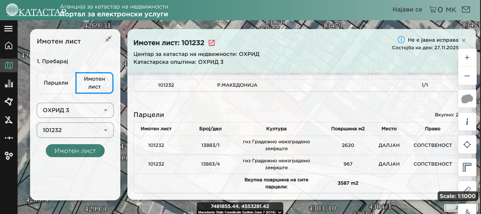 Извадок од д имотниот лист од парцелата каде е паднат борот од кој се гледа дека земјиштето е во сопственост на државата.
