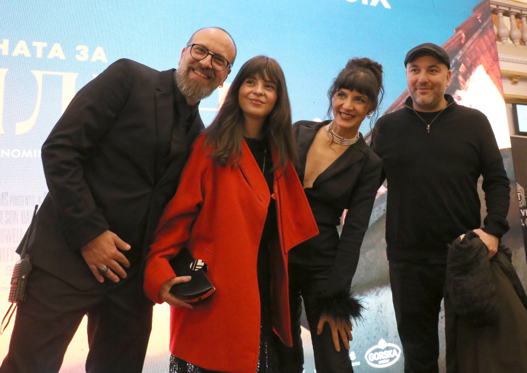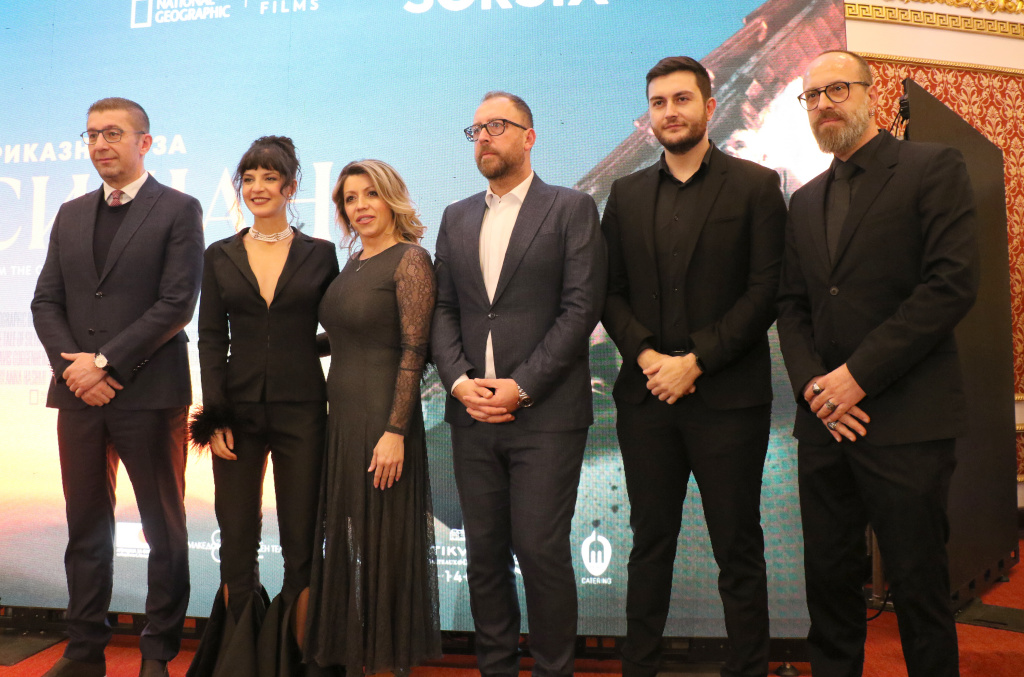 Премиерот Христијан Мицкоски, Котевска, сопругата на премиерот Рози Мицкоска, министерот за култура Зоран Љутков, директорот на Агенцијата за филм Сашко Мицевски и продуцентот Јорданчо Петковски. (Фото: К. Попов)