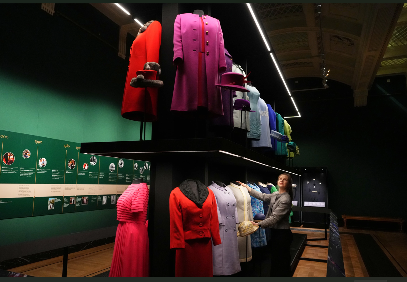 Двата фустанa, дизајнирани од долгогодишната кројачка на Елизабета, Ангела Кели, се изложени еден покрај друг, иако верзијата на дублерката има голем патент на задниот дел за да се приспособи на падобранот. Изложбата, составена од околу 4.000 предмети што некогаш ѝ припаѓале на кралицата, истражува како модата станала едно од нејзините најмоќни средства за комуникација. Елизабета имаше само 26 години кога го наследи својот татко на британскиот престол во 1952 година и потоа стана британски монарх со најдолг стаж во историјата.
