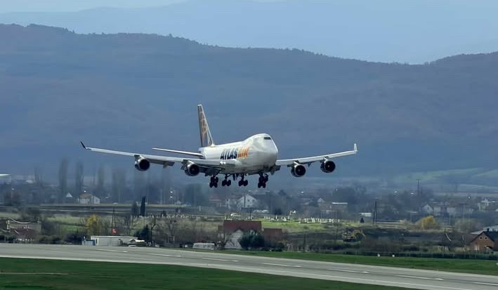 Транспортен џамбо авион од типот „боинг 747“ на американската компанија „Атлас ер“ утринава слета на Скопскиот аеродром. Долета од американската воена база Довер на источниот брег на САД.