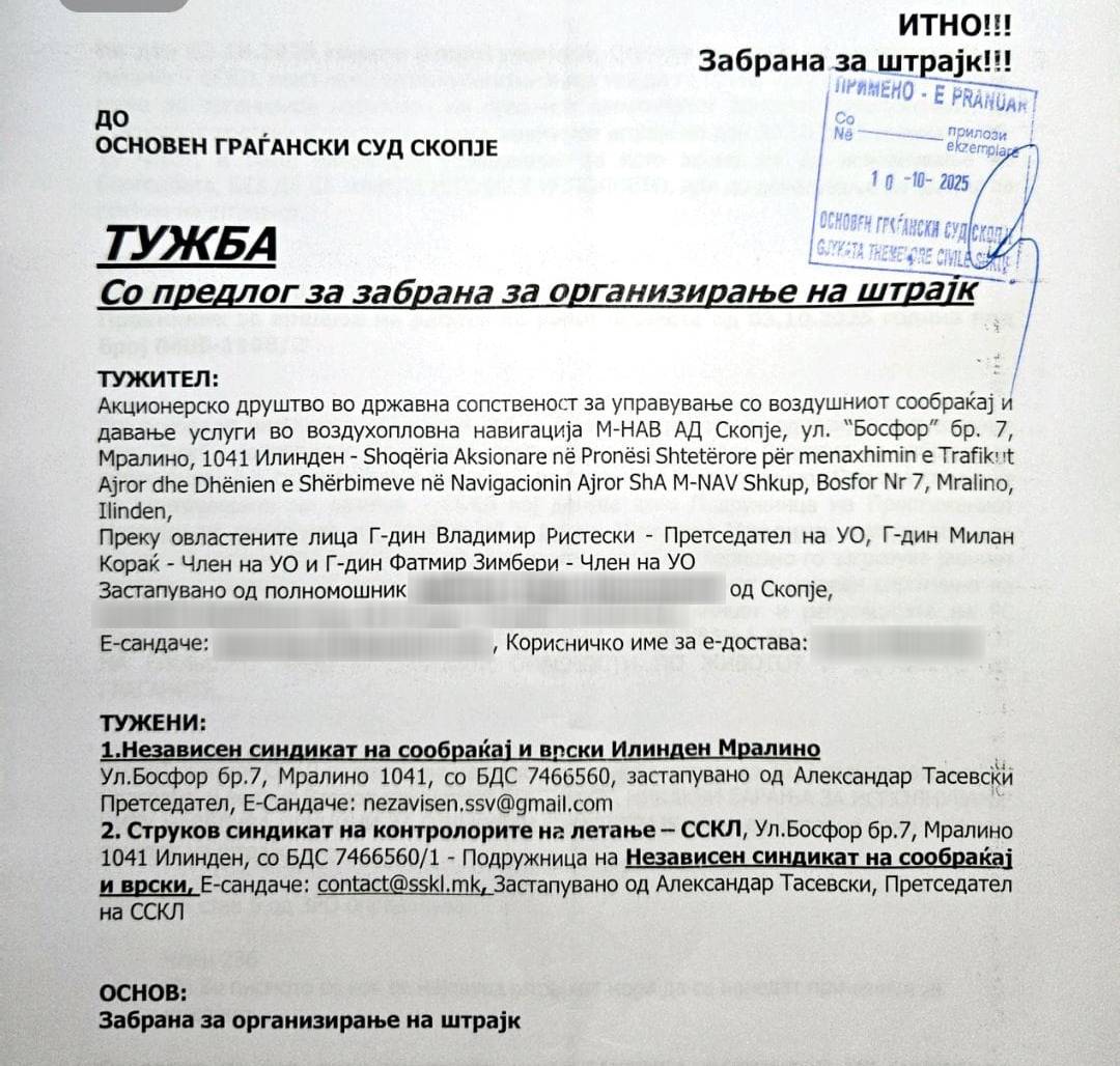 Судијката Сашка Трајковска од Основниот граѓански суд Скопје по поднесената тужба од тројцата директори на Македонска навигација (М-НАВ) со Предлог за забрана за организирање на штрајк, денеска го забрани најавениот штрајк за 20 октомври од страна на Синдикатот на контролори на летање.