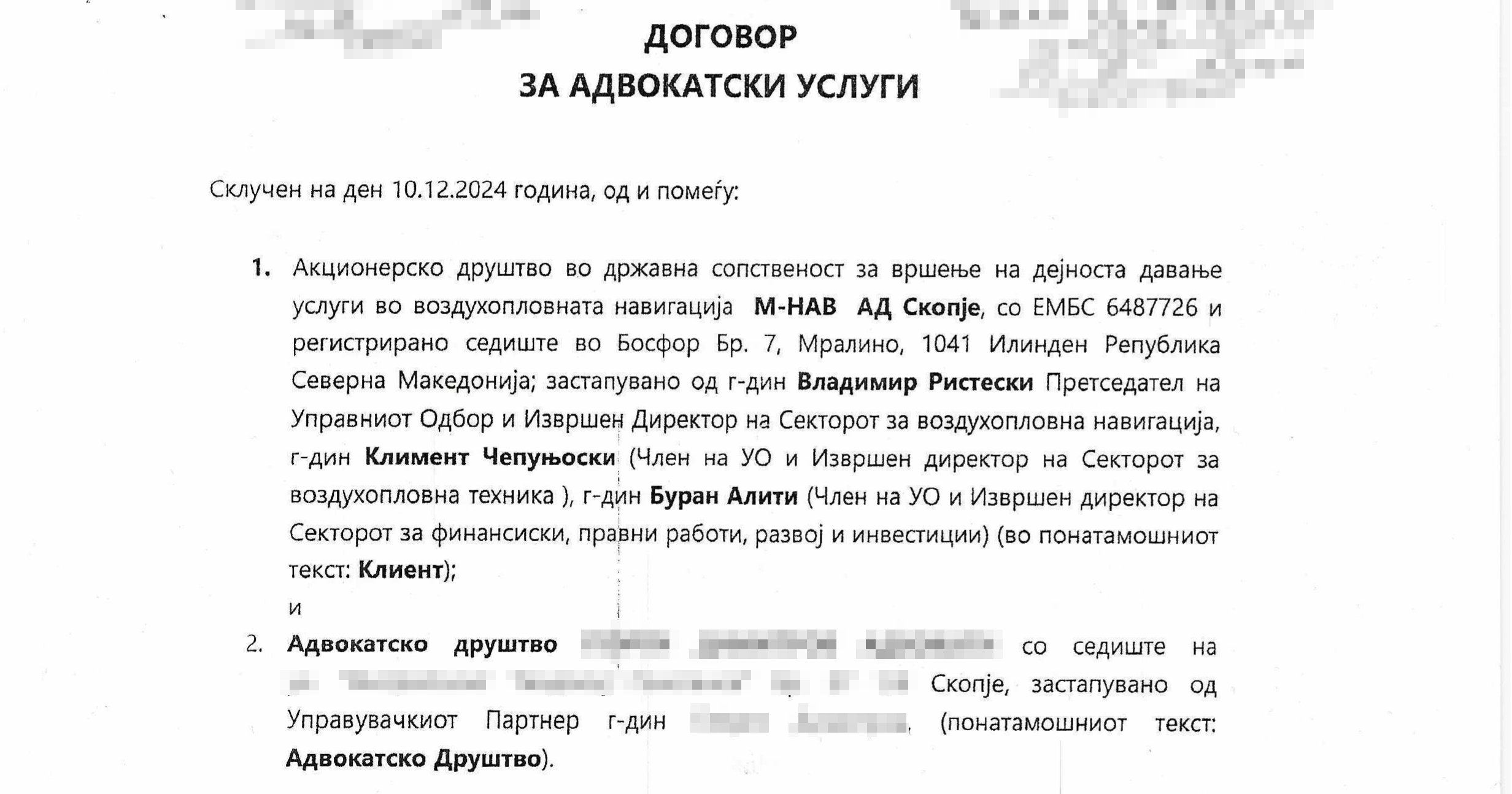 Извадок од првата страница од договорот за застапување на М-НАВ од страна на адвокатско друштво. (Фото: СДК.МК)
