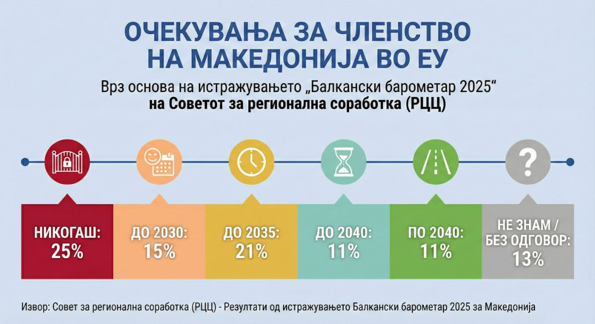 Четвртина од граѓаните на Македонија (25 отсто) сметаат дека земјата никогаш нема да стане членка на Европската Унија, покажуваат резултатите од најновото истражување „Балкански барометар 2025“ на Советот за регионална соработка (РЦЦ).