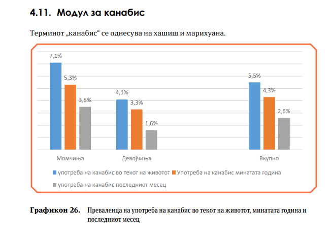 Пет отсто од речиси 3 илјади ученици на 15 и 16-годишна возраст пријавиле дека користеле канабис барем еднаш во животот, 4,3% во последната година, додека 2,6% пријавиле употреба во последниот месец од истражувањето на Институтот за јавно здравје (ИЈЗ). Терминот „канабис“ се однесува на хашиш и марихуана.