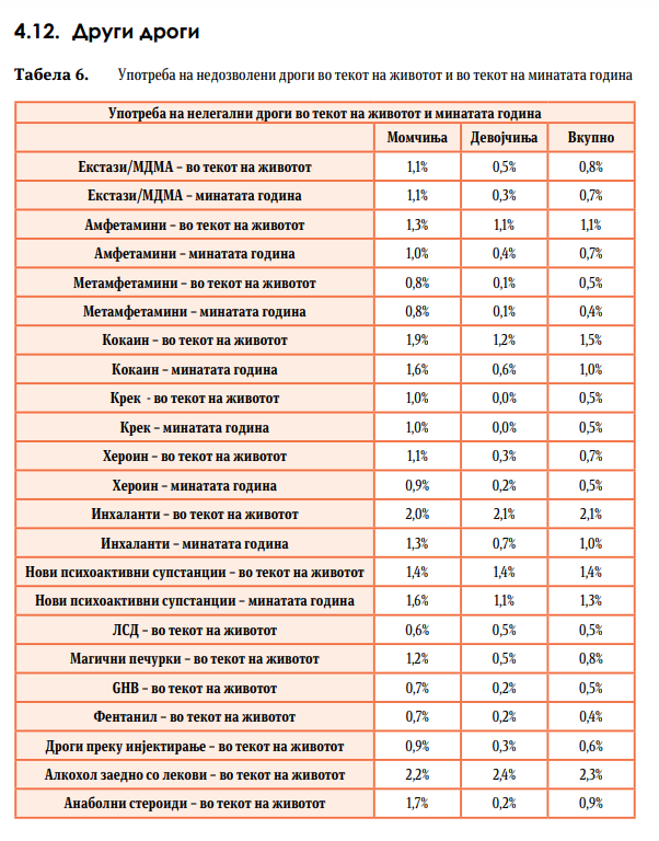 „Иако овие бројки се скромни во споредба со употребата на алкохол или тутун, конзистентноста на консумирањето канабис сугерира дека тоа останува постојан и нормализиран елемент на ризично однесување кај адолесцентите. Употребата на други недозволени супстанции како што се екстази, амфетамини и кокаин останува релативно ниска, генерално под 2%. Сепак, злоупотребата на лекови како што се транквилизери/седативи и лекови против болки, се чини дека е почеста. Околу 6,6% изјавиле дека користат транквилизери/седативи без рецепт, а 10,1% користеле лекови против болки за да се надуваат ‘хај’. Овие однесувања се особено загрижувачки поради перцепцијата дека фармацевтските производи се ‘побезбедни’ или помалку недозволени, и затоа што тие често се подостапни за адолесцентите преку ординациите на лекарите, но, и преку нивните родители/ баби/дедовци кои најчесто ги имаат овие лекови дома“ вели извештајот.