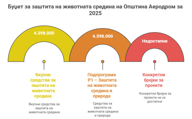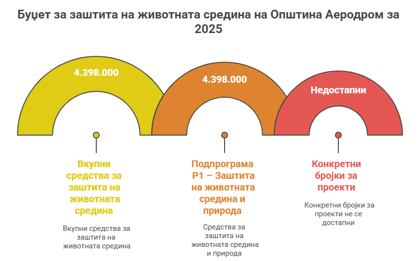 Буџетот за заштита на животната средина на Општина Аеродром за 2025 беше 4.398.000 денари (околу 71.000 евра). Иако се споменува дека средствата ќе се користат преку Подпрограма Р1 – Заштита на животната средина и природа, конкретните бројки (колку пари за зеленило, а колку за субвенции) не се лесно достапни во објавените извадоци.